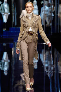 Вдохновившись наполеоновской эпохой Dolce&Gabbana предложили в этом сезоне гвардейский шик, реплики из которого были подхвачены многими дизайнерами: укороченные жакеты, золотые пуговицы в два ряда, воротник стойка, блестящие эполеты – к приему военного парада готовы! О солдатских буднях напомнит двубортный жакет, перехваченный грубым кожаным ремнем, брюки-голифе или солдатский бушлат, строго, благородно и изысканно.!