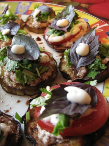 Теперь выкладываем на обжаренные кружочки баклажанов пасту, сверху помидорку, еще немного майонеза, украшаем рубленой зеленью - обязятельно с кинзой.