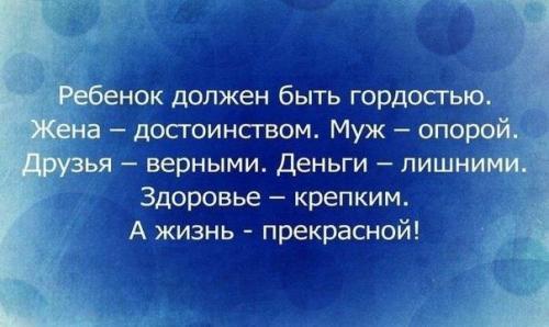 В тему о шешнадцатилетних и мудрости интернета. У дочки есть сестра двоюродная (по бывшему мужу), они вКонтакте друзья. А я, как любопытная мама регулярно (раз в неделю обязательно. А как же?!?) просматриваю, что там у дочки происходит. И эта двоюродная сестра регулярно публикует у себя на стене и присылает моей такие перлы: я помню подхожу к тебе - ты от меня отходишь .. Я помню – звонишь, а там труба уже не в зоне.. Мне нравится9 18 мар в 0:51|Ответить суди о человеке больше по его вопросам, чем по его ответам! Так как ответы можно украсть... Мне нравится6 15 мар в 0:49|Ответить человек, который хочет выделиться из толпы, становится человеком из стада, которое хочет выделиться. не забывайте. все мы люди. все о чём то молчат, что то скрывают, о чём то думают. что то вспоминают.. Мне нравится7 13 мар в 1:22|Ответить чем тише омут, тем умнее черти.. Мне нравится5 12 мар в 23:55|Ответить Нервы, сигареты, зажигалка. Прикурить .................... и сойти с ума от мыслей... Мне нравится13Поделиться1 2 мар в 22:05|Ответить pribilo tak chto ya nevuvojy ishy sebya glazami no nenahazhy... Мне нравится4 20 фев в 21:55|Ответить просто люди, суки, тоже должны отвечать за свои поступки. Мне нравится5 8 фев в 0:22|Ответить Ложь не считается ложью, если является ответом на вопрос, который не должны были задавать. Мне нравится4 3 фев в 17:19|Ответить Скорость ни разу никого не убила, внезапная остановка… вот что убивает. Мне нравится5 30 янв в 21:20|Ответить не будь жмотом — дай человеку второй шанс. Не будь идиотом — никогда не давай третий. Мне нравится3 26 янв в 22:52|Ответить Ху*ня все это ваша любовь. Лучше кота на улице покормите. и то больше взаимности будет.. Мне нравится5 27 дек 2012|Ответить Ну и так далее........ И ведь все всерьез!!! А ведь ей уже не 16....... (И сразу такая не слишком хорошая мысль: Как замечательно, что моя не такая! Какое счастье, что они так отличаются. Я своей горжусь!) Хотя, должна признать, я пока лазила в инете нашла одну цитату, в которую сразу влюбилась!