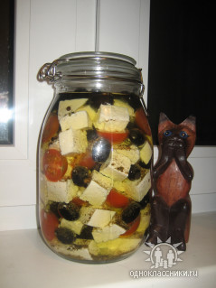 Маринованный домашний сыр Нужно: 3 литра пастеризованного молока 3,2% жирности (можно жирней). 6 сырых яиц, 2 ложки сметаны Масло оливковое 800-900 гр. Баночка маслин, 250 гр. помидор черри, приправы. 2,5 чайной ложки соли. В половину литра молока добавляем 2 ложки сметаны и оставляем киснуть на ночь при комнатной температуре. Добавляем в прокисшее молоко 6 яиц и хорошенько перемешиваем. Остальные 2,5 литра доводим до кипения и добавляем туда простоквашу с яйцами. Кипятим минут 15-20 пока творожная масса не отделится от сыворотки (минут 15-20 хватает, что бы отделилась и приобрела плотность). В дуршлаг стелим ткань и откидываем туда наше варево. Завязываем и вешаем стекать жидкости. В это время нагреваем масло в кастрюльке до сильно теплого состояния и добавляем туда чайную ложку соли и приправы (я добавлял перец горошком и приправу для салатов из пакетиков), ставим в сторону и ждем пока остынет и впитает в себя ароматы трав. Сырную массу как стекла вода можно еще отжать руками. Выкладываем ее в глубокую посуду добавляем 1,5 чайной ложки соли и хорошо перемешиваем. Накрываем тарелкой меньше по диаметру, ставим гнет и в холодильник на пару-тройку часов (я выкладываю массу с солью уже в ту же ткань в которой стекала вода, сильно закручиваю и кладу в холодильник). Через три часа вынимаем спрессованный сыр из холодильника, режим кубиками и укладываем в банку сломи с помидорами черри и маслинами. Заливаем все это ароматным маслом и ставим на сутки (можно больше) пропитываться и мариноваться. Сыр хорош в салатах и с теплыми лепешками. Приятного всем аппетита.