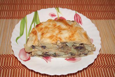 Знаю один ленивый рецепт, для тех кто возится с тестом не хочет. Итак: Пирог из лаваша с курицей. 1 лист тонкого лаваша, 150г сметаны, 2 яйца НАЧИНКА 250г лука, 700~800г куринного филе, ~1 ч ложка соли, перец, 0,5~1 стакан воды или бульона, 500г картофеля Куринное филе порезать мелко и потушить с луком до готовности. Картофель почистить, порезать маленькими кубиками и положить в кипящую подсолёную воду на 3~5 минут. Воду слить. Картофель перемешать с тушёными желудками. Яйца разболтать со сметаной. Лист лаваша разорвать пополам. На половинку листа налить 2~3 ст ложки сметанной смеси и равномерно размазать кулинарной кистью. Уложить в форму диаметром 20~24см так, чтобы лаваш повторил контуры формы. Точно также поступить со второй половинкой лаваша - намазать и уложить в форму. Половину начинки выложить в форму и закрыть сверху свисающими концами верхнего листа лаваша. Выложить вторую часть начинки. Закрыть краями нижнего листа лаваша. Верх смазать оставшейся сметанной массой. Поставить в духовку при t=180~200°C на 20~25 минут.