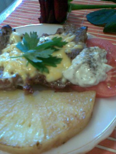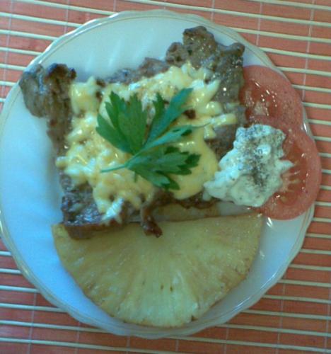 Балую себя обедом. Много кушать не хочется, но есть вещи, которые я могу употреблять в любом состоянии. Конечно же, это животный белок. Нет, не то, что вы подумали, а мясо. =) Когда-то давно меня очень удивил повар в Дакоте жареными ананасами. Сначала мне было любопытно, а потом понравилось. Нигде больше я не видела в меню это экзотическое соединение жареные ананасы со стейком. В Дакоте я не была тоже очень давно, но иногда мысли мои тревожили томные, с мясным соком ананасы. Итак, берем сырой ананас, замаринованное заранее мясо. Я отдаю предпочтение в последнее время говядине. Итак, от ананаса отрезаем слайс и делим его пополам. Слайс толщиной сантиметр, можно чуть уже. На 5-7 минут кладем этот половинный слайс в маринад и маринуем вместе с мясом. Я мариную в оливковом масле, лимонном соке и специях (черный молотый перец, прованские травы, душистый перец горошки) само мясо от получаса до суток, в зависимости от необходимости. После - наливаем на горячую сковородку оливковое масло, солим его и кладем на среднем огне мясо, рядом ананас. Прикрываем крышкой и жарим 5-7 мин. Потом переворачиваем и мясо и ананас, еще 5-7 мин с другой стороны. Потом снимаем крышку и жарим с каждой стороны на большом огне по 3 мин до образования аппетитной золотистой корочки. Сервируем с кружочками помидора, зеленью петрушки и белым соусом. Ах да, и бокалом красного сухого. Вот вам картинка.   Вчера на ужин я решила по новому посмотреть на авокадо. Я взяла его, немного зелени, соль с перцем и дольку чеснока и сделала совершенно замечательную пасту. Её намазала на кусочек ржаного хлеба, отдельно взяла нежный бри и стакан белого вина и пошла ужинать и ждать любимого. Сегодня на завтрак хотела сделать к бри сливовый соус, но не успела. Еще он хорош с малиновым или клубничным соусом, но это уже действительно летом. Сообщение отредактировал Корица - 27.10.2008, 18:04