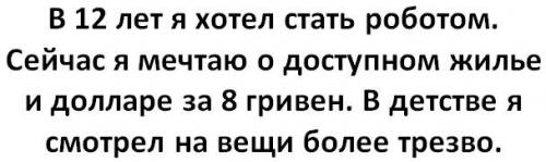 Скоро мой др, родители спрашивают, что я хочу в подарок. Я - хочу ролики Р - это опасно, расшибешься! Не нужны тебе ролики. Я - ну хорошо, тогда компьютер Р - зрение посадишь, не нужен тебе компьютер. Я - кошку хочу. Подарите мне котёнка! Р - От нее шерсть, она мебель испортит, и потом, ты за ней наверняка следить не будешь, а оно нам не надо! Я - буду следить, честно! Р - но мебель она все равно испортит Я - тогда хомяка Р - он воняет Я - ну тогда не знаю... Р - эх дочка, мечты у тебя нет.. Забирает жена нашего первоклассника из школы, он рассказывает, как прошел день, что задали на завтра. Потом некоторое время идут молча. И тут малый выдает: "Мама, хочешь я тебе расскажу легкий мат?" Жена говорит: "Вот, думаю, началось. Понятно, это школа, там можно услышать от детей все что угодно. Начинаю мысленно готовиться, как ему лучше объяснить что можно говорить, а что нельзя". Настроилась, значит, на поучительный тон. "Ну говори". "Так вот", вещает малый, "представь, что у тебя есть ферзь, слон и проходная пешка..."  Ребёнок после посещения зоопарка пишет сочинение, как провёл выходные: "Видел оленя. У него наша вешалка на голове".  Для того чтобы определить для себя хорошее и плохое среди живого и неживого в мире, трехлетняя девочка задает всего один вопрос: - Кусается?
