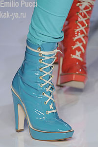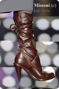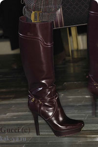 Наиболее актуальная модель на осень полусапожки из твида с лакированным носком, или глянцевые на высоком каблуке из кожи рептилий. Кожаные полусапожки со вставками из текстиля и меха. Сапоги на зиму берем на устойчивом каблуке или на шпильке с замысловатой шнуровкой.