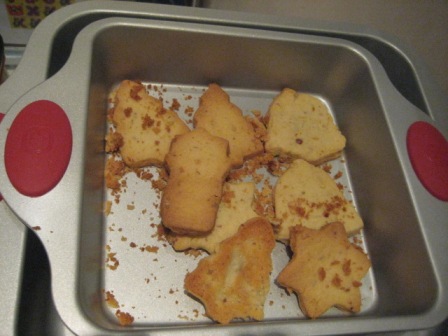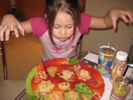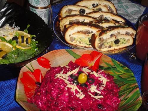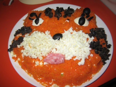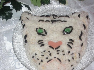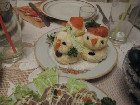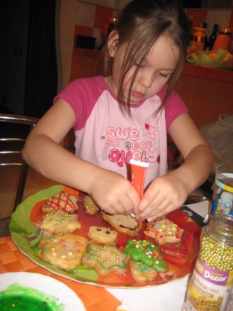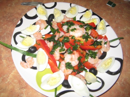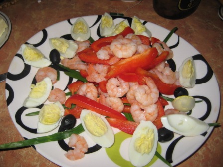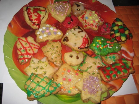 Маруся, а рулет тяп-ляп вы не делали? Я сначала хотела сделать, но у меня дома крахмала не оказалось. Вот что сделала я. Все на вынос. Праздновали у родителей дома: 1. Салат "Подсолнух" по рецепту который тут нашла:  2. Салат "Тигрик" тоже тут у вас нашла:  \ 3. Салатик с креветками. Сделать решила в последний момент. Креветки, вареные яйца , сладкий перец, поставила зеленый лук хотя надо было салат-латук. ))) И заправила, соусом из петрушки, чесночка, соли и под. масла. Вот что получилось. К стати, креветки варила 5 минут. ) ) До заправки  После заправки  . Еще мы пекли рождественское печенье. Вот так это было:  Украшаем:   Нападаем:  Вот оно: Сообщение отредактировал likefire - 1.1.2010, 18:49