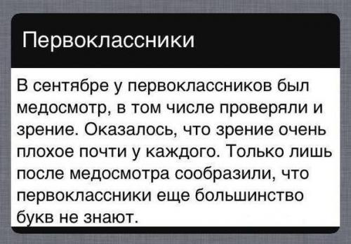 Цитата(Масуми @ 20.12.2013, 1:49)  Удивительное совпадение!  И мой так же отвечает. Есть еще варианты: была контрольная (практическая работа, диктант, сочинение, лабораторная работа) и ничего не задали. Еще: "Учительница была на хоре  , я не услышал что задали (видимо кабинет был длиной метров 50  ), задали то же самое (?). Вспомню все варианты еще добавлю. Ага, не успел записать, потому что с доски все стерли. Или номера остались, а "выучить правило"- стерлось  Цитата(Масуми @ 20.12.2013, 1:49)  задали то же самое (?).
