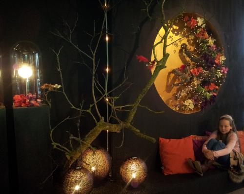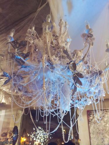 В общем, она тоже подвешена к потолку, состоит из шариков, сделанных из ниток. Не знаю ,как это делается, но такле впечатление, что нитки наматывают на надутый шарик, смазывают клеем а затем, когда они высыхают, шарик сдувают.
