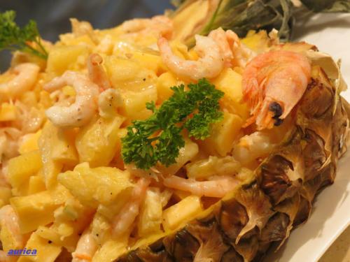 салат с креветками в ананасе Для приготовления такого салата нам понадобится 1 большой ананас, 500 гр неочищенных креветок, 50гр твердого сыра, 2 зубчика чеснока и пару ст л натурального йогурта. Креветки отварить 2 мин и очистить.Ананас разрезать пополам и аккуратно вынуть с помощью ножа и ложки мякоть и нарезать ее кубиками ,сок слить в чашку.Сыр тоже нарезать кубиками,смешать все ингридиенты ,в сок добавить йогурт,соль ,черный перец и чеснок через пресс,заправить салат и выложить его в лодочки от ананасов.Очень оригинально и вкусно!!Приятного аппетита!!