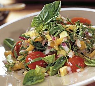 Салат с хурмой и авокадо. Шаг 1 шаг 2 Лук очистить. Помидоры, шпинат и кресс-салат вымыть. Шпинат нарезать полосками, лук – мелкими кубиками, помидоры разрезать пополам.