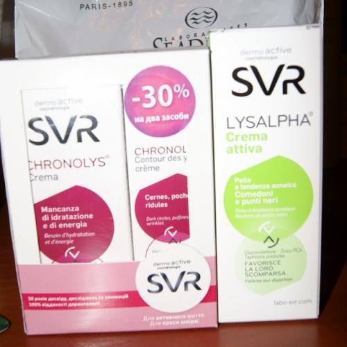 Давно хотела попробовать средства от SVR, а именно линейку Хронолис от 26 до 35 лет. Мне как-то пробники давали и мне понравились средства, но отдельно не брала т.к. было дорого, а тут наткнулась на акцию: 2 крема как раз те, которые мне нужны, со скидкой 30%. Взяла не раздумывая, хотя тётя фармацевт опять пыталась впарить мне Eucerin, но я после пробников не в восторге от этой марки, а SVR уже пробовала и мне нравится (SVR мне предложили в другой аптеке, но этой же сети, заодно и Урьяж). Зелёный крем взяла раньше, это активный крем для жирной кожи с акне. Потом умывалку хочу их взять, когда моя от Авен закончится. Сообщение отредактировал Mistress - 5.2.2014, 22:55