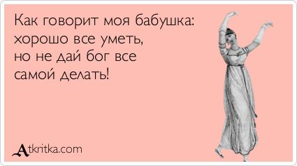 Цитата бывало и не по стандарту работали. бгг..бывало... Опишу в двух словах одну из причин, по которой я таки сделала ноги с этой работы.. Я в одноклассниках на работе (строчные транзиты..все сделала жду такси..и..параллельно общаюсь с нашей Рысью)..все бы ничего..но на часах 1 ночи! Цитата все равно - отвыкли от прибираний на выходных, равно как и от генеральных уборок перед праздниками. Бусинка, ну в каждой избушке свои погремушки... Я тоже как бы сторонник пословицы - чисто не там, где убирают, а там, где не ссорят... *тут еще такая фигня..вы же с мужем вдвоем живете..а дети, знаешь ли..(даже если они подростки) всегда вносят свои коррективы в быт* Цитата ваще начиналось все о взрослых детях, за которыми мамы убирают. У меня мама ездила иногда на выходных к брату в институтскую общагу и драяла им комнату Стыдно ли брату было? Не думаю  Там все соседи брата по комнате готовы были ее на руках носить..Убрала, вкусненького привезла на всех..жрать всем сделала