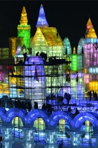 В Харбине построили 20-этажный ледяной дворец. Строители доставили для этого более 200 килограммов ледяных блоков, их собрали вместе, затем залили водой, чтобы они застыли. После этого рабочие начали полировку стен постройки.