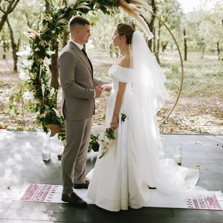 Однією з найромантичніших послуг є виїзна церемонія в саду. Під кронами яблунь, на фоні природного ландшафту створюється ідеальний простір для обміну клятвами. Цей формат особливо подобається парам, які мріють про атмосферне та щире одруження без зайвих формальностей.